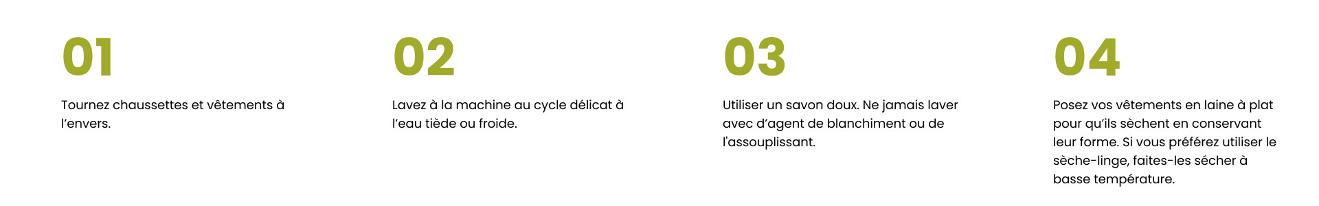 Non, il est préférable d'éviter d'utiliser un assouplissant lors du lavage de la laine mérinos, car il peut laisser un résidu sur les fibres et affecter leurs propriétés naturelles, telles que l'évacuation de l'humidité et la résistance aux odeurs.