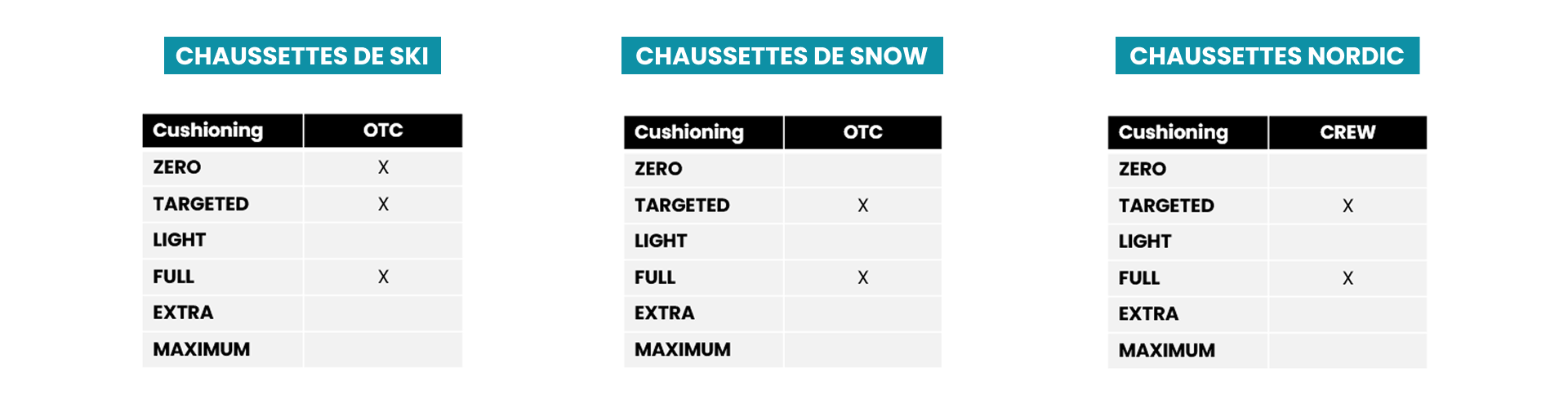 Nos chaussettes de ski et de snowboard sont disponibles en différentes hauteurs et niveaux de coussin pour que vous puissiez trouver la paire parfaite qui vous apportera le plus de confort. Vous ne savez pas quelle épaisseur de coussin choisir ? Consultez notre guide de coussinage des chaussettes.