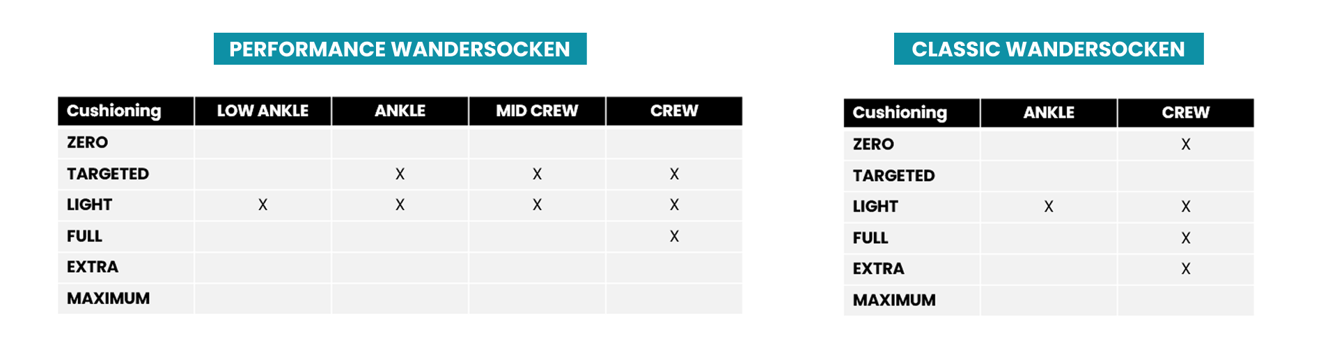 Unsere Wandersocken sind in verschiedenen Höhen und Polsterungsstufen erhältlich, damit Sie das perfekte Paar finden, das Ihnen den größten Komfort bietet. Nicht sicher, welche Polsterung Sie wählen sollen? Schauen Sie sich unseren Sock Cushioning Guide an.