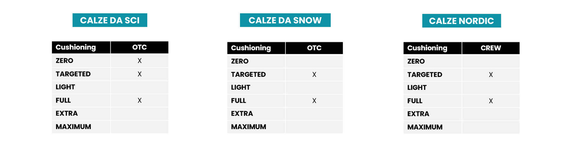 Le nostre calze da sci e snowboard sono disponibili in diverse altezze e livelli di ammortizzazione, così puoi trovare il paio perfetto che ti offrirà il massimo comfort. Non sei sicuro di quale ammortizzazione scegliere? Dai un'occhiata alla nostra guida all'ammortizzazione delle calze.