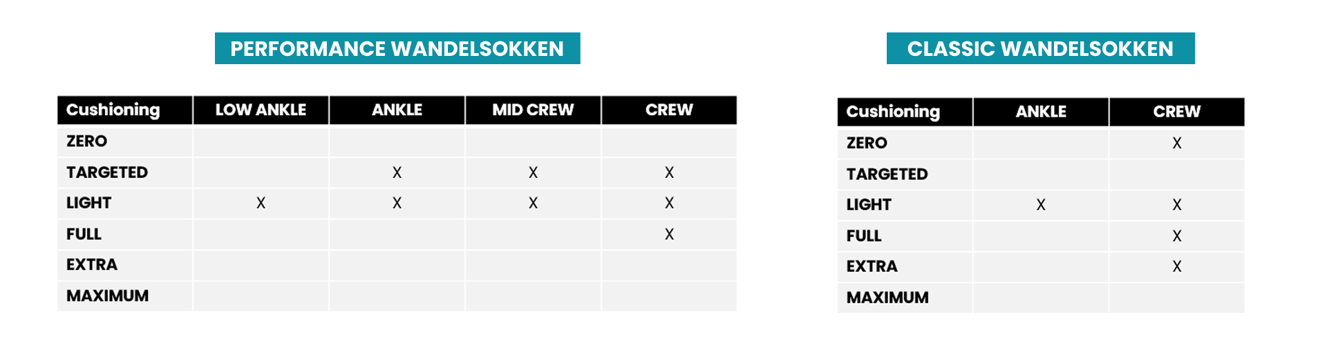 Onze wandelsokken zijn verkrijgbaar in verschillende hoogtes en dempingsniveaus, zodat je het perfecte paar kunt vinden dat je het meeste comfort biedt. Niet zeker welke demping je moet kiezen? Bekijk onze Sock Cushioning Guide.